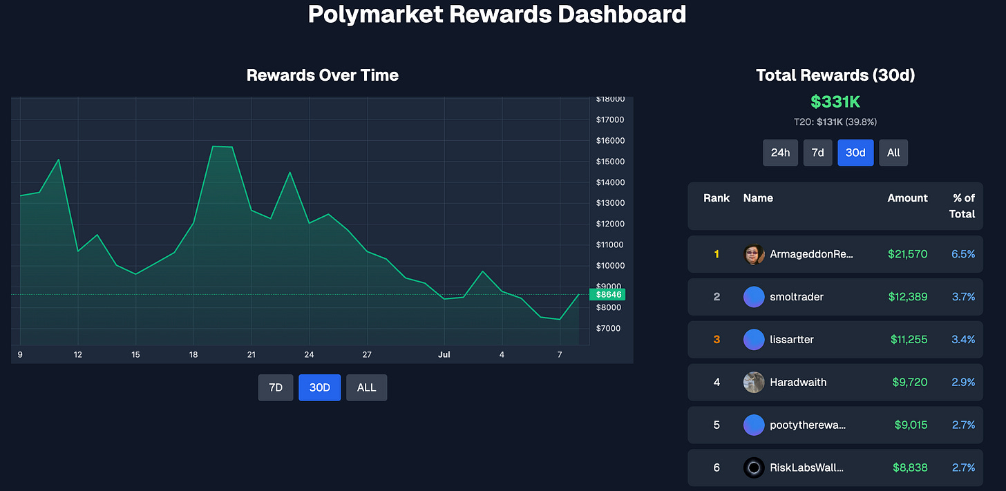 Então dá pra ganhar yield na Polymarket? Sim! Nos últimos 30 dias, U$331K em USDC foram pagos aos provedores de liquidez.