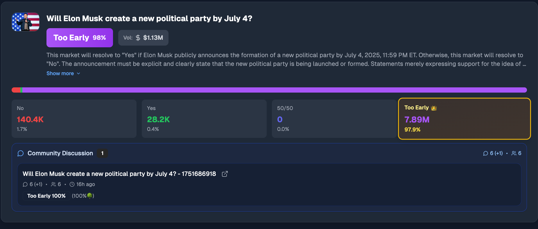 No exemplo acima, há uma votação sobre o resultado do mercado “Elon Musk criará um novo partido político até 04 de julho?”.