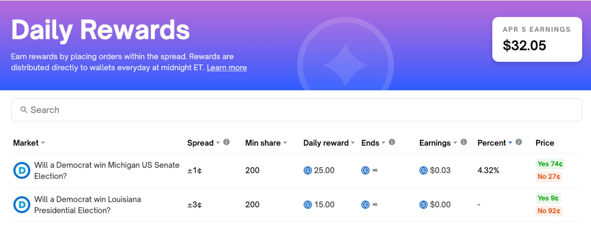 Chamadas de Daily Rewards, a Polymarket paga em criptodólares, para traders manterem ordens abertas nos seus mercados. O objetivo é dar mais liquidez para a plataforma, e uma experiência melhor para quem está negociando nela.