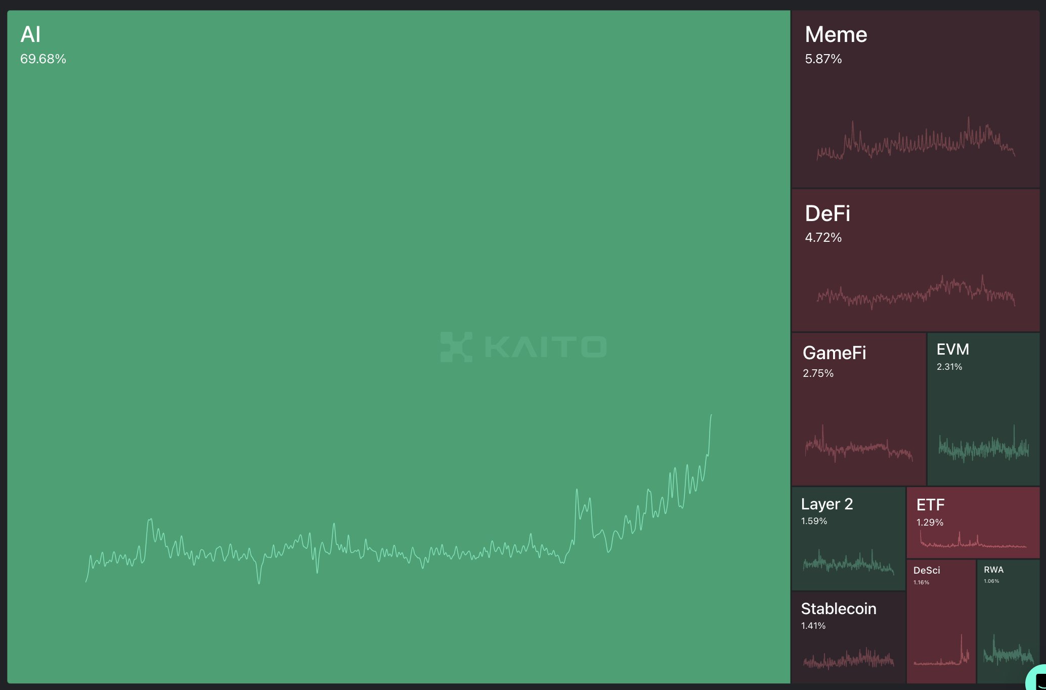 Nos últimos meses, a atenção sobre tokens relacionados a inteligência artificial dominou o mercado. O mindshare no cripto-twitter chegou a 70%, ou seja, 70% das pessoas na rede social estão falando de AI.