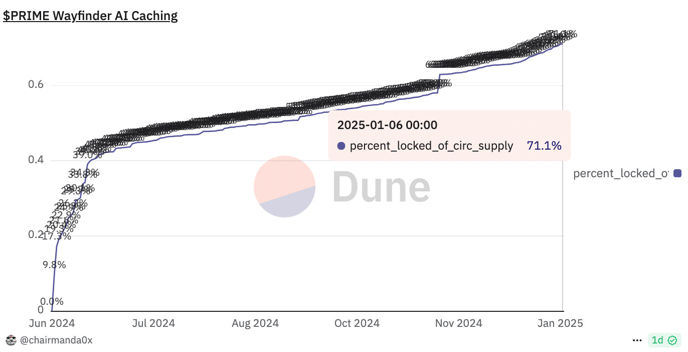 O $PROMPT será distribuído via airdrop para quem fizer stake de $PRIME, token da Echelon Prime. 40% do supply de $PROMPT será destinado aos stakers. O interesse pelo airdrop é tamanho, que mais de 70% dos tokens em circulação da Echelon Prime estão travados no Wayfinder.