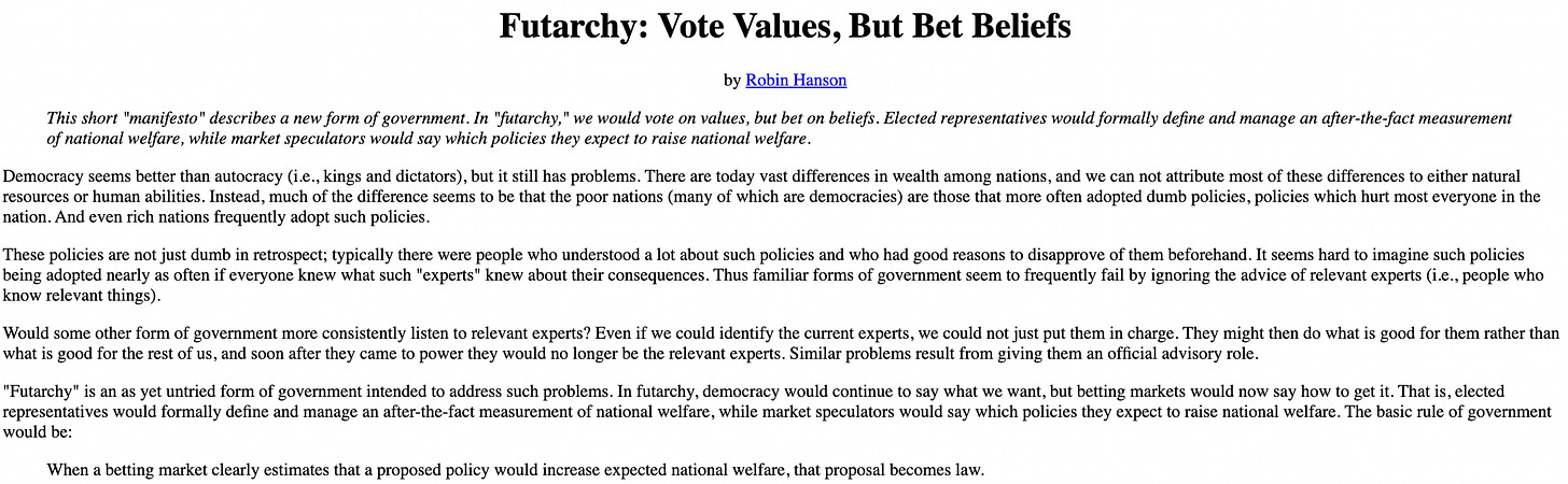 Futarquia é um forma de governo proposta por Robin Hanson, no começo dos anos 2000.