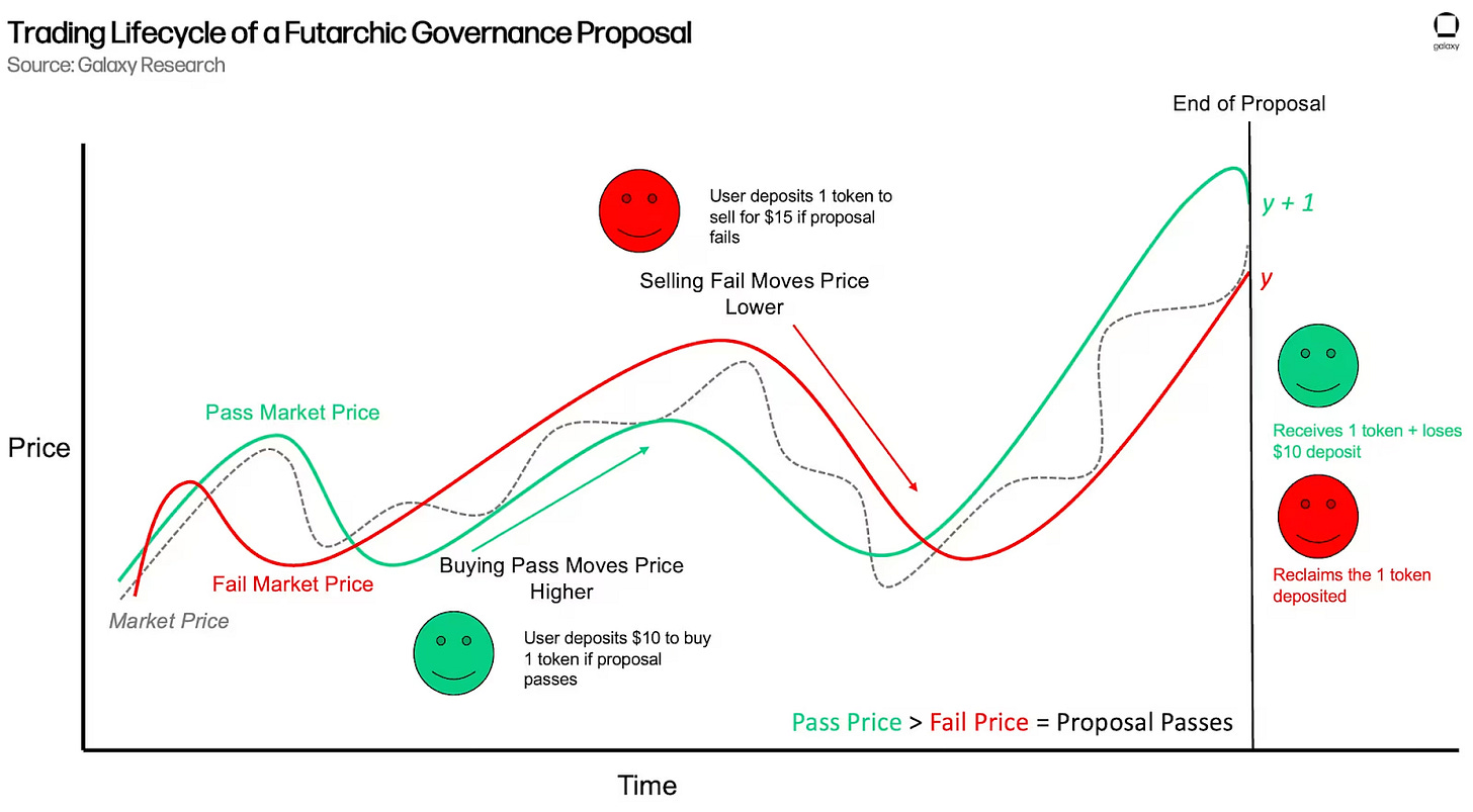A dinâmica da Futarquia numa organização descentralizada é permitir que o mercado decida quais propostas devam passar. Semelhante à ideia de Robin Hanson para governos, mas aplicada a protocolos descentralizados.