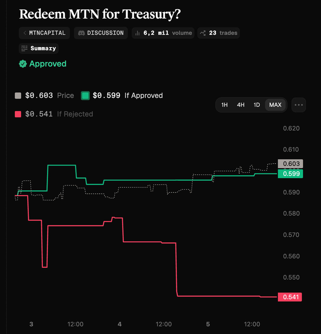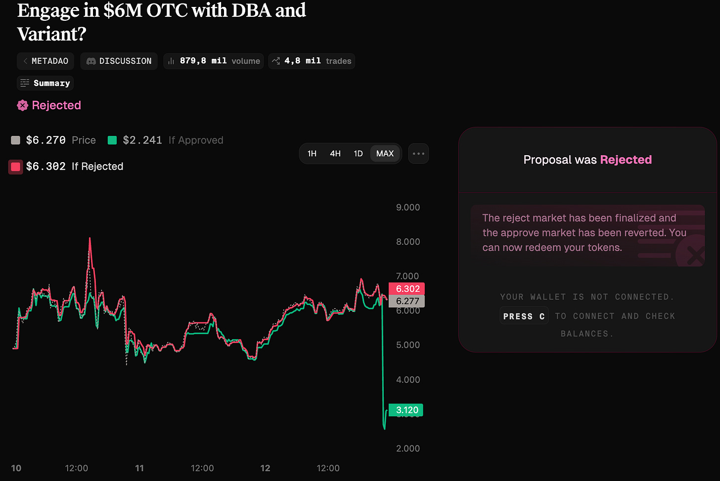 No exemplo da imagem acima: a proposta propôs comprar U$6M de $META (token da MetaDAO) por um preço abaixo do mercado.