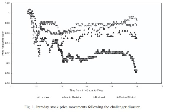 O governo americano demorou 4 meses para identificar o motivo da explosão: uma falha numa peça fabricada pela Morton-Thiakol. Em contrapartida, 16 minutos depois da explosão, as ações da empresa despencaram.